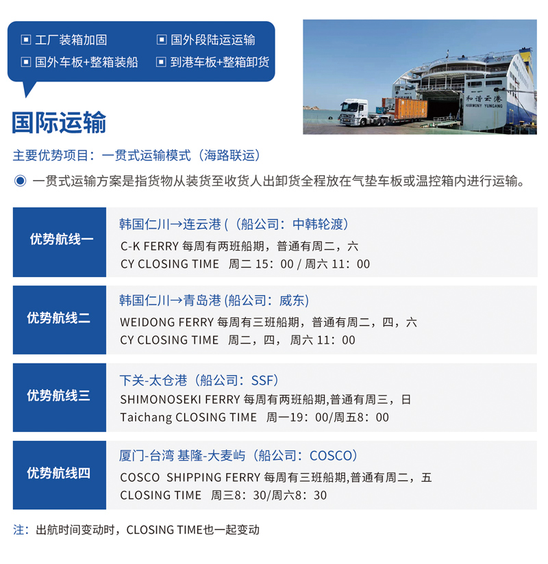 客户可以根据自身需要选择服务范围(门到门,港口到港口,港口到门)和时间要求。我们将为客户提供包括可以利用的最快船期和最经济船期在内的多种运输方案,并实时对货物进行控制,结合IT系统满足您的跟踪和追溯要求。